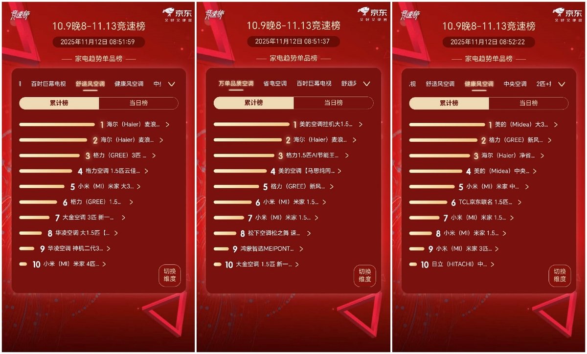 从阔绰趋势来看,本年双11,健康、安适、高品性的空调居品更受用户怜爱。在此布景下,海尔空调凭借精确的居品定位与时代上风,竣事多款居品热销:海尔麦浪安适风空调以“东谈主近风柔、东谈主离节能”的智能感知才气,在双11周期平稳保执安适风趋势空调TOP1;在“万单品性空调榜”上,海尔空调位列TOP2,体现出用户对其居品品性的平方认同;海尔小红花净省电Plus空调则依托健康安适与节能的双重上风,踏进“健康风趋势空调榜” TOP3。
